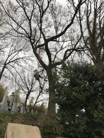 岩﨑造園では、ロープによるクライミングで、ハシゴでは届かない高木も剪定可能です。